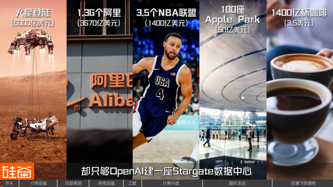 5000亿美元,是NASA预估能让人类完成火星登陆的预算、能买下1.36个阿里(3670亿美元)、3.5个NBA联盟(1400亿美元)、建设100座Apple Park(50亿美元)、买1400亿杯咖啡(3.5美元),却只够OpenAI建一座Stargate数据中心。