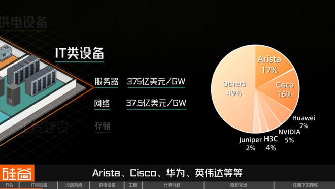 在网络方面,每GW需要37.5亿美元的网络设备,其中的主要玩家分别是Arista、Cisco、华为、英伟达等等。