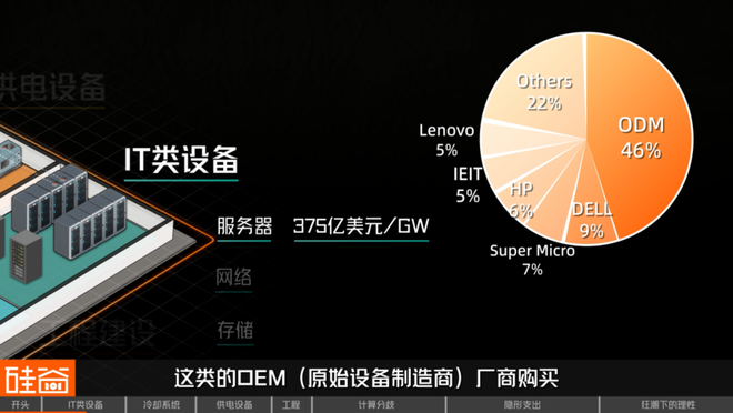 首先是与计算直接相关的IT类设备,分为服务器、网络、存储三块,其中的大头就在服务器身上,每GW大概需要375亿美元。