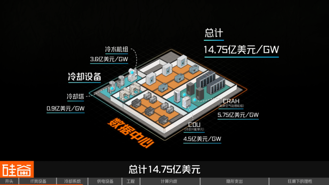 而对于配备液冷系统的数据中心来说,冷却设备主要包含冷却塔、冷水机组、CDU(冷却分配单元)和CRAH(机房空气处理机组)。要承担1GW的散热,它们分别需要支出0.9亿、3.6亿、4.5亿、5.75亿,总共14.75亿美元。