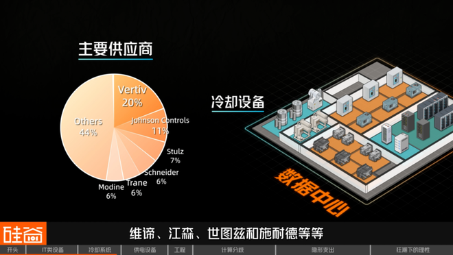 主要供应商由于分散在各个环节,数量众多,我们就不一一列举了,但其中维谛(Vertiv)、江森(Johnson Controls),世图兹(Stulz)和施耐德(Schneider)等等,都是这个领域的大玩家。