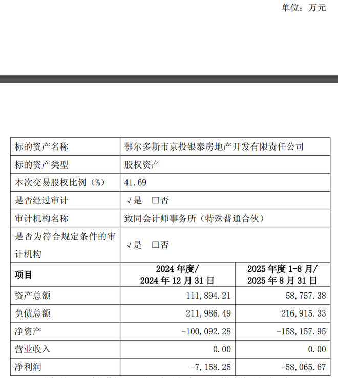 截至评估基准日2025年8月31日,经北京天健兴业资产评估有限公司评估,鄂尔多斯公司净资产为-15.82亿元,股东全部权益评估价值为-15.88亿元。截至本公告披露日,鄂尔多斯公司正常存续经营。