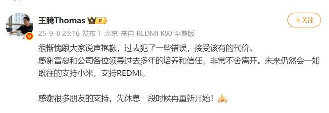 8日晚,王腾于个人微博回应:“很惭愧跟大家说声抱歉,过去犯了一些错误,接受该有的代价。感谢雷总和公司各位领导过去多年的培养和信任,非常不舍离开。未来仍然会一如既往的支持小米,支持REDMI。”(凤凰网科技)