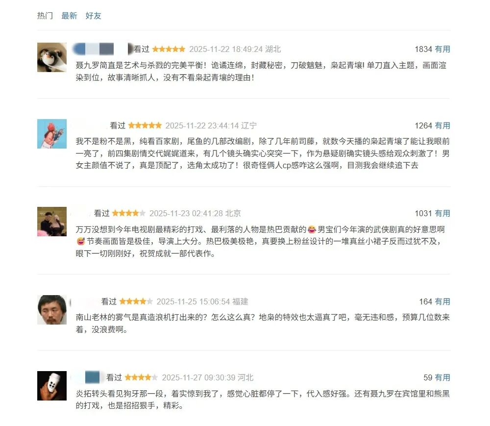 不仅如此,在腰部阵营中,以《棕眼之谜》《他为什么依然单身》为代表的中体量制作,分别凭借罗生门的悬疑架构与中年都市情感剧定位,收获7.1和6.9的豆瓣评分,成为11月的口碑黑马;《树影迷宫》《四喜》等现实题材作品,则以特色的胡同质感与一地鸡毛的生活气息稳健开局,建立起稳定的热度与口碑;而《枭起青壤》虽然暂未开分,但也凭借出色的制作水准赢得广泛好评,尤其是动作场面,被不少观众赞为“年度最佳打戏”。