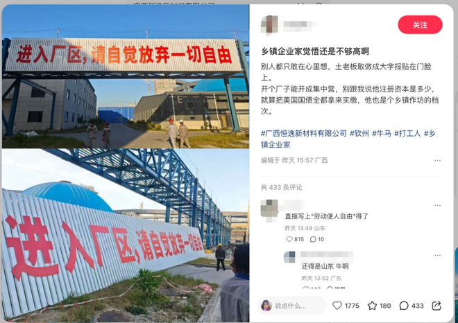 近日,一家工厂悬挂的标语“进入厂区,请自觉放弃一切自由”在网络引发热议。