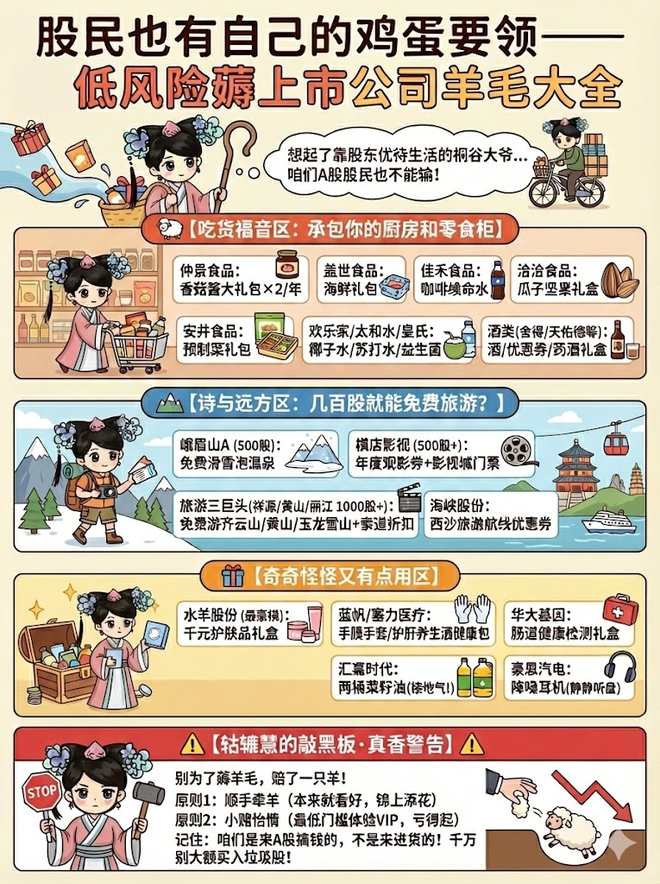 慧慧连夜爆肝,给各位搞钱小能手们整理了这份《A股低风险薅羊毛大全(近期版)》。虽然咱们还没法像桐谷大爷那样彻底“白嫖”生活,但这波操作如果搞得好,家里的零食柜、化妆台和明年的旅游计划,基本就被上市公司承包了!