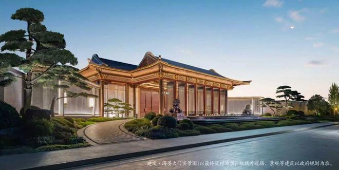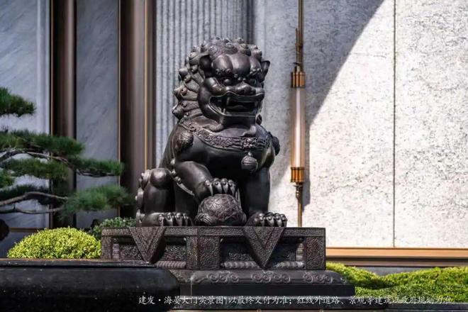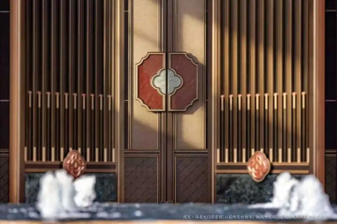 八檩抱厦之下,王府门楣之间,双奥书法大师郭宝庆题写的建发・海晏四个大字,笔墨之间,辉映古今,彰显京派王府的庄重与厚蕴。匾额之下,大门正中,国家级玉雕非遗传承人、北京奥运会“金镶玉”奖牌设计者张铁成大师操刀的门钹,古铜色及金色不锈钢,海棠形上搭配奢石内嵌玉雕,镌刻出京派王府世代风华。