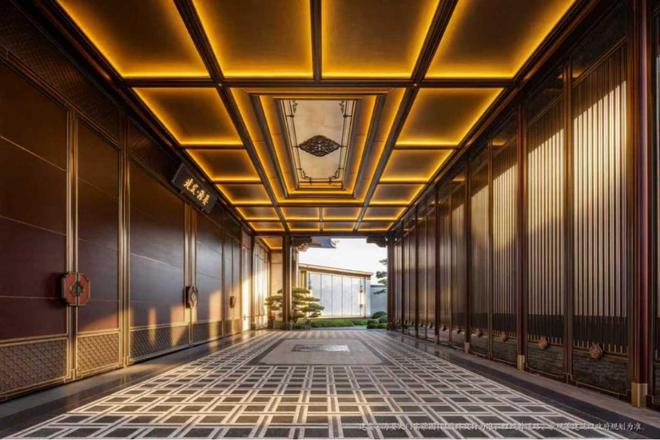 飞檐翩然起翘,庄重仪态中承载悠悠历史,成以雅阙金阁般的恢宏气象。檐下朱韵流转的斗拱纹,与金属复合鎏金柱、赤金铝板幕墙、超白玻璃等元素相互映衬,皆化作宫廷冠冕与鎏光天幕的贵雅大气。最后,海晏汲皇家最别致的“宫墙红”,在颐和园邀月门形制而成的云门上,复刻王府规制的威仪气度,印刻东方独有的神韵与尊荣。