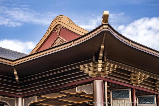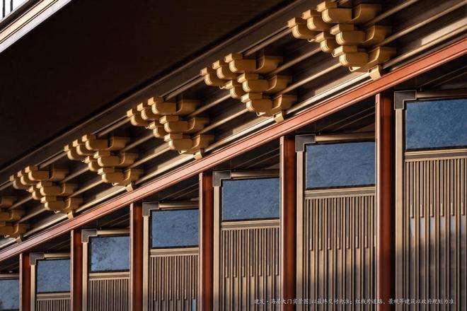 府门之“形”即参照东宫门形制的八檩抱厦门殿,屋顶亦承袭颐和园的卷棚歇山顶,恢弘之间尽显皇家雍容大气之风范。屋顶延伸出的飞檐翘角,恰似“如跂斯翼,如矢斯棘,如鸟斯革,如翚斯飞”,灵动优雅之余,尽显古典艺术与天人哲思。约6.6米高的双檐下,金属色的斗拱随檐而出,在古典营造法之中,糅合现代建筑工艺,完美演绎“古韵今风”的建筑之美。