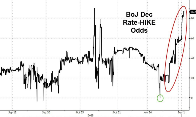 植田和男的言论已促使市场消化的12月加息可能性达到约80%。一位消息人士对路透表示,政府的立场是“如果日本央行本月想加息,请自行决定”,这被视为默许央行采取行动。