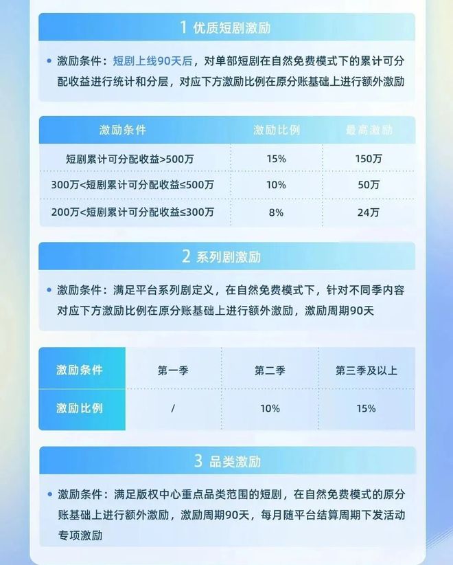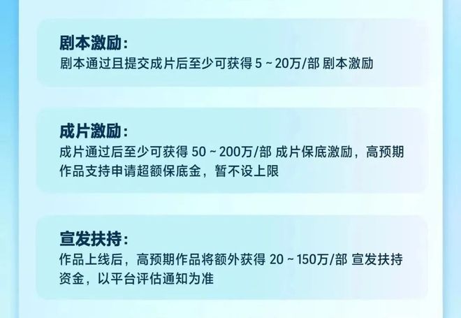 其次是激励力度更大。此次平台展现出极大的诚意与投入,从针对头部作品的激励,辐射更多作品和品类,涵盖剧本、成片、宣发的分级保底,对中小团队更友好。