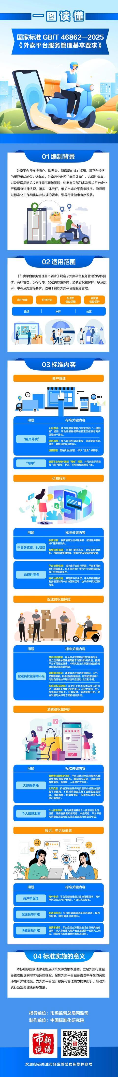 《基本要求》遵循科学性、规范性、实用性、前瞻性原则,在充分调研外卖平台服务管理实践经验的基础上,对现有法律法规和监管要求进行细化和补充,广泛采纳商户、配送员、消费者等多元主体意见建议,切实帮助外卖平台优化管理方式、提升服务质量、实现多方共赢,进一步推动外卖行业在良性竞争中创新发展。