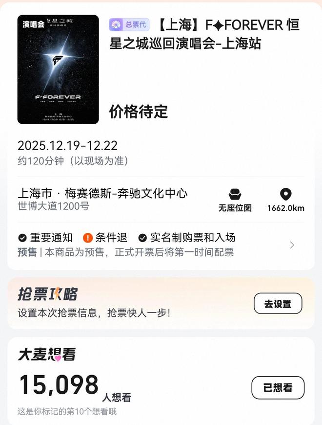 12月4日,据票务平台信息显示,“F✦FOREVER 恒星之城巡回演唱会-上海站”即将开售,此次演唱会将于12月19日至22日在上海举行,目前价格待定。