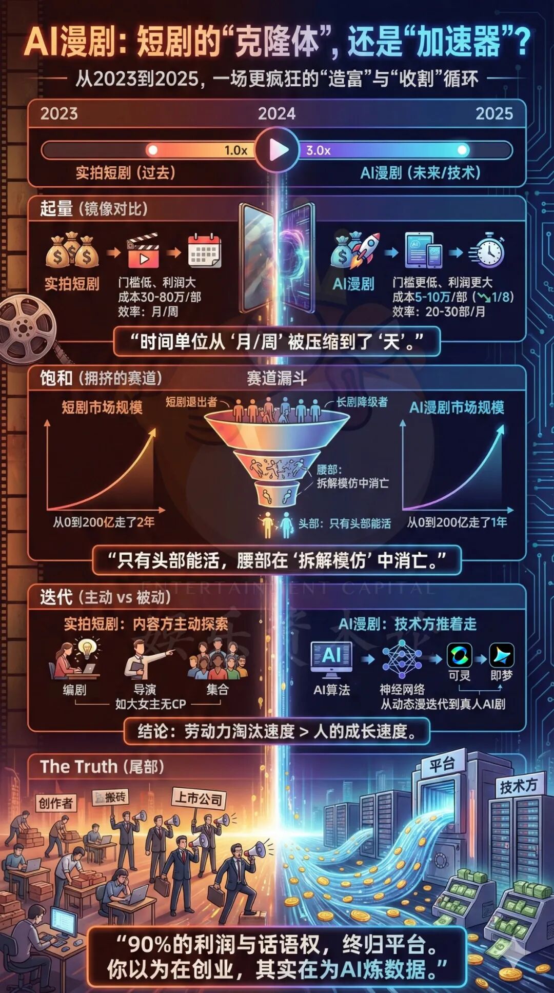 从十月底开始,AI漫剧这一概念横空出世,快速成为整个文娱行业和资本市场共同关注的焦点。人们将2025年的AI漫剧与2023年的短剧类比,打造出一个新的“AI漫剧”元年。
