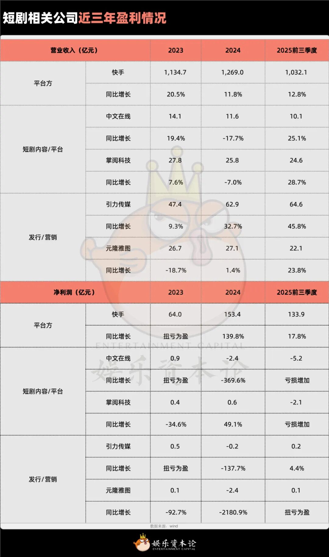 小娱在统计长剧公司的短剧布局时,曾发现没有任何一家长剧公司在财报中主动披露微短剧业务的收入和利润情况。而这一次,小娱研究了短剧概念股中的内容/平台公司、发行/营销公司的财务情况,发现:1)短剧概念股的收入增速整体低于市场规模增速,表明在大量玩家进场的竞争格局中成功或仅是个案;2)内容公司的收入增速低于发行/营销公司、低于平台,在投流模式下,平台必然掌握最终话语权,而且很可能只有一个超级头部平台获胜;3)不管是内容端还是发行端,保持盈利都并非易事。