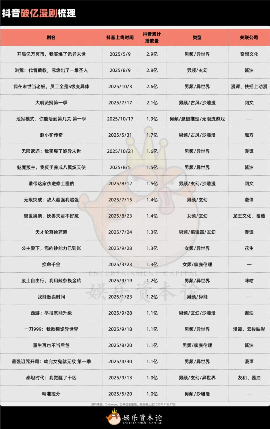 抖音破亿漫剧梳理,资料来源:Dataeye,公开信息整理。数据截止至2025年11月27日。