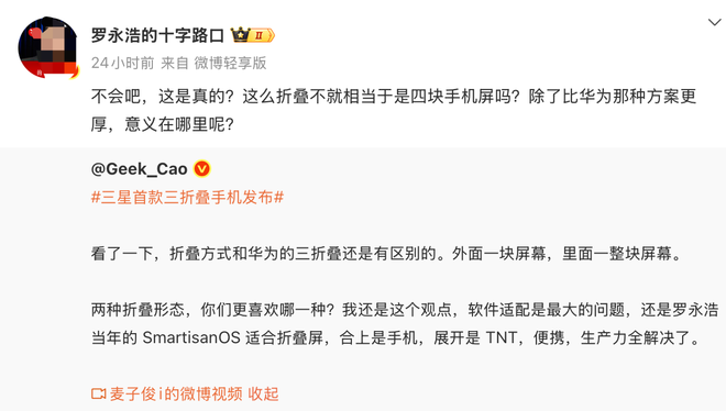 “除了比华为那种方案更厚,意义在哪?”近日,科技名人罗永浩对三星最新三折叠手机Galaxy Z TriFold的犀利吐槽,迅速在中文互联网上引发热议。