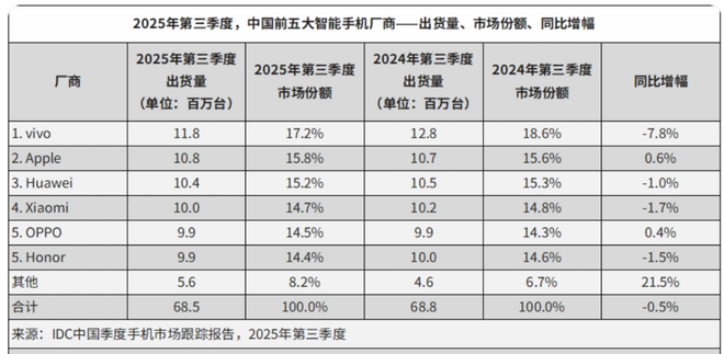 据IDC最新数据,2025年第三季度中国手机市场前五名中,不见三星身影。这与它仍是全球第一的地位形成鲜明反差。