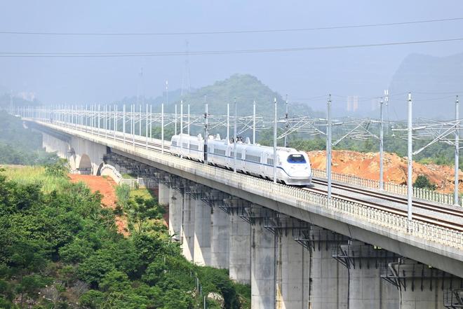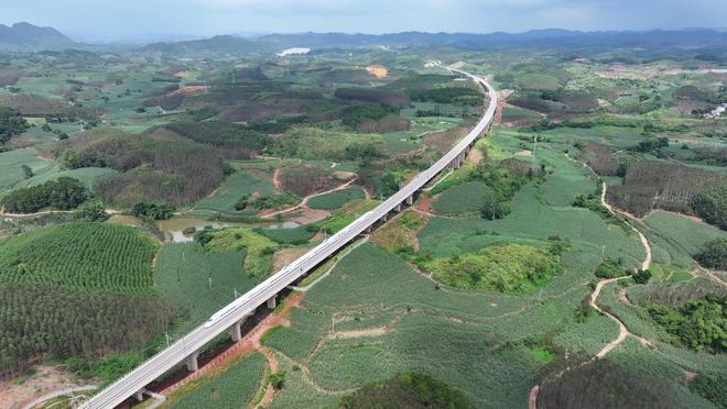▲列车在南凭高铁崇凭段宁明东—龙州站间运行