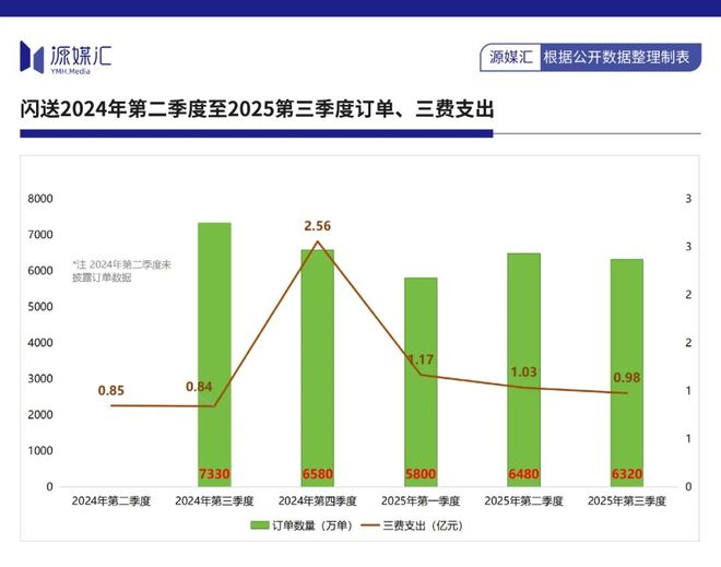 随着即时零售战火越烧越旺,闪送的订单数量开始呈现下滑趋势。2024年三季度为7330万单,2025年三季度为6320万单,同比减少约13.8%。2025年前三季度,闪送累计完成1.86亿单,同比减少12%。