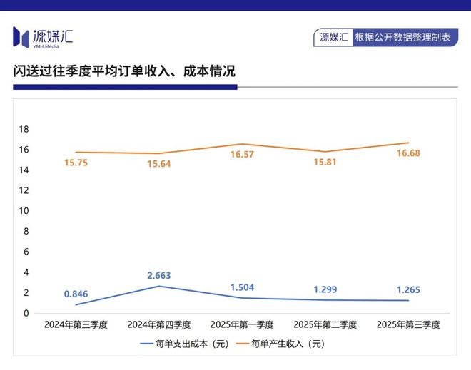 尽管闪送单个季度每笔订单收入呈现波动向上,但整体处于下滑中——2025年三季度每单产生收入为16.08元,同比减少1.15%。当前,闪送的经营状态恰恰容易走到其提及的"良性循环"相反的一面。