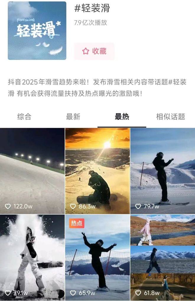 夜场滑雪、雪地电音派对成了Z世代的新宠,抖音上“轻装滑”话题播放量接近8亿次,年轻人们用滑雪服搭配潮流穿搭,把雪场变成了冬日社交场。