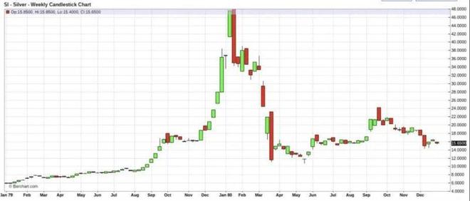 1980年,白银在四个月内从10美元飙升至48美元,但两个月后又跌回10美元。