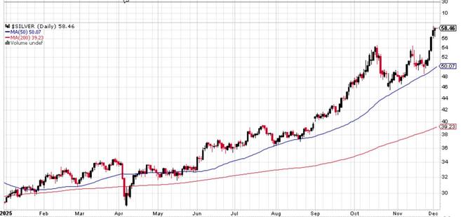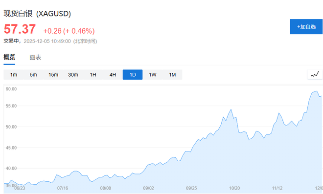 周五,白银延续回调走势,一度跌破57美元关口,本周早些时候一度触及每盎司近59美元的历史高位,此前该金属已连续八个交易日上涨,单日回调幅度超过2%。14日相对强弱指数显示,白银已从超买区域回落至70下方,此前的快速上涨势头有所放缓。