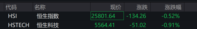 恒指低开0.4%,报25833.11点;恒生科技指数跌0.41%。腾讯控股跌1.1%,京东、网易跌超0.9%,阿里巴巴跌0.8%。