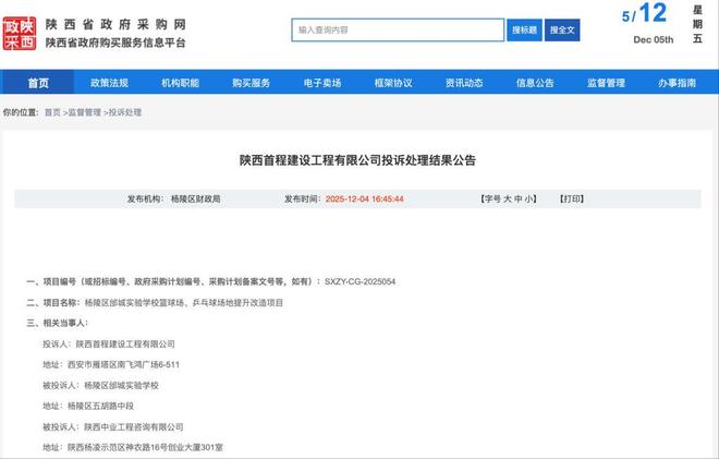 12月4日,杨陵区财政局在陕西省政府采购网发布《陕西首程建设工程有限公司投诉处理结果公告》。