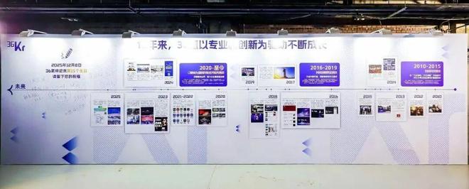 ● 职场红利派对门口的“36氪发展史”介绍墙。15年来,36氪以专业和创新为驱动不断成长。