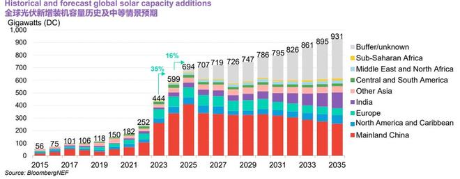 进入2025年,光伏装机量的增长,进一步引发了白银需求的爆发式增长。受136号文的影响,国内光伏行业在今年出现抢装潮,国内强劲的装机需求叠加欧洲等地的向好态势,共同带动全球光伏装机再创新高。根据彭博新能源的预计,今年全球光伏装机将会达到694GW,同比增长16%。