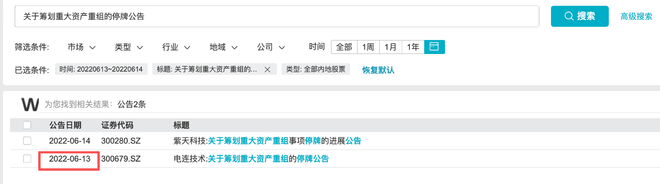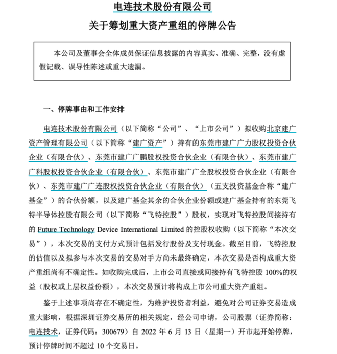 记者查询发现,根据Wind和巨潮资讯信息,2022年6月13日当日,市场仅有电连技术(300679.SZ)发布《关于筹划重大资产重组的停牌公告》。