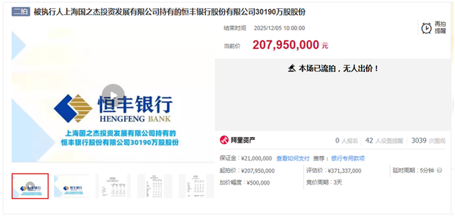 蓝鲸新闻12月5日讯(记者 金磊)12月5日,上海国之杰投资发展有限公司持有的恒丰银行股份有限公司30190万股股份因无人出价而流拍。