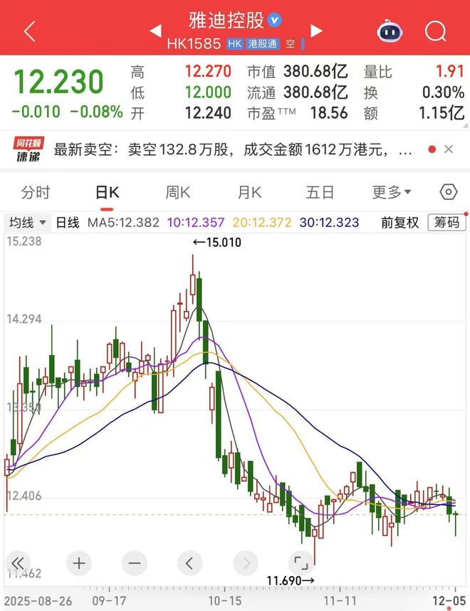 截至12月5日收盘,雅迪控股(1585.HK)收跌0.08%,报12.23港元/股,总市值380.68亿。港元股价较今年最高点(2025年3月18日)下跌41%,市值较最高价时减少109.25亿港元。