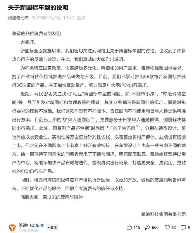 雅迪针对新车型设计发表道歉声明,表示对新国标理解不准确,将推出优化版车型,此前,雅迪新车型因设计问题引发争议,公司表示将认真吸取教训,重新审视并加强内部研发流程,确保未来产品符合国家标准和消费者需求,此次事件提醒了雅迪在标准化工作中的重要性,并将努力改进,雅迪因新车型设计问题道歉,将推出优化版车型,并加强内部研发流程以确保未来产品符合国家标准。