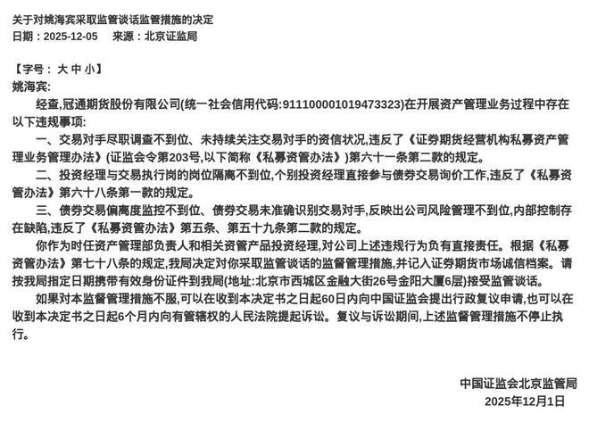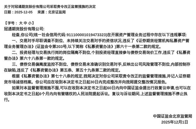 蓝鲸新闻12月5日讯,近日,中国证监会北京监管局发布了行政监管措施决定书,剑指冠通期货股份有限公司及相关责任人。