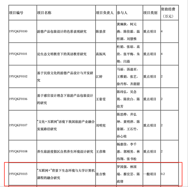 12月6日,澎湃新闻查询发现,成都游憩环境技术研究院曾于2019年发布了一份《中国休闲文化研究中心研究基地 成都游憩环境技术研究院开放性课题立项评审结果的公示》。该公示显示,张吉惟作为项目负责人,与林国瑞、蔡宜芸、陈政倩等人组队申报了一项名为《“互联网+”背景下生态环境与大学计算机课程的融合研究》的项目。该项目经过专家现场评审、通讯评审,获批立项。