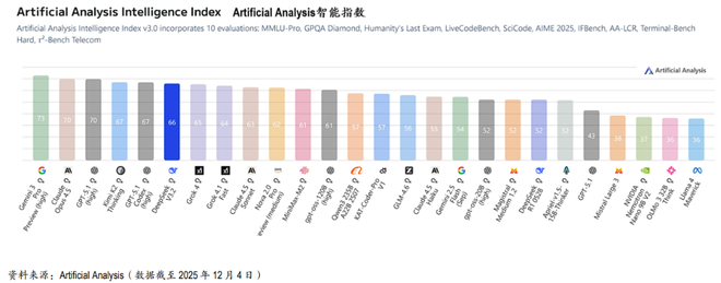 在ArtificialAnalysis的智能指数与价格对比中,DeepSeekV3.2处于“高智能、极低价格”的绝对优势象限。