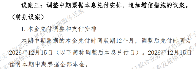 第三项议案同样要求提供增信措施,本金展期至2026年12月15日,展期前尚未支付的利息须于2025年12月15日支付。![]()