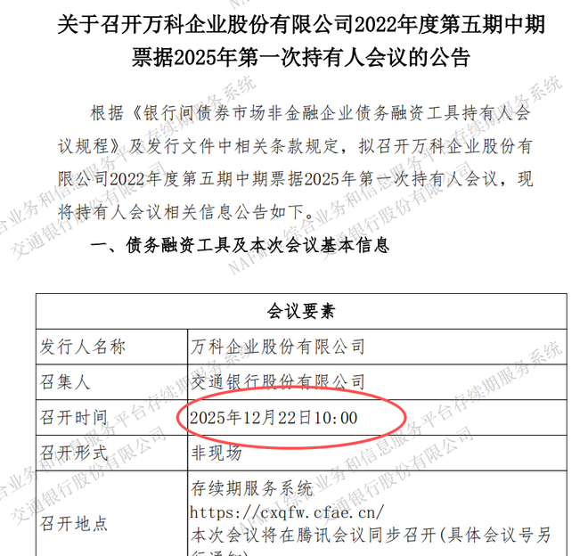上海清算所12月5日晚间公告显示,万科将召开"22万科MTN005"持有人会议,商议该债券展期事宜。该债券余额37亿元,本计息期利率3%,原定于2025年12月28日到期。会议召集人为交通银行,将于12月22日召开。