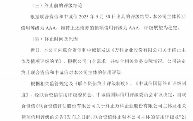 同日,万科还宣布终止联合资信和中诚信对其主体的信用评级。根据两家机构2025年5月30日出具的评级结果,万科主体长期信用等级为AAA,评级展望稳定。