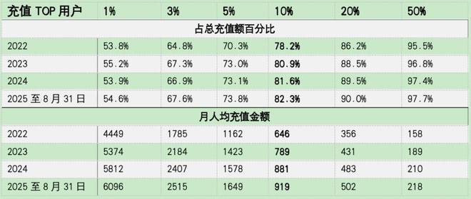 购买头像和Avatar的货币来自活动赠送和充值,绝大部分用户选择浅尝辄止,而少数用户则为了头像和礼物狠狠氪金,这部分用户是Soul ARPU值增长的真正来源。招股书显示,2025年至今Soul充值额在前10%的用户占总充值额的82.3%,且这个比例在过去3年里持续上升,月均充值额则从2022年的646飙升到919。