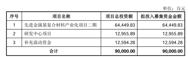 本次有研复材拟募资9亿元,分别用于先进金属基复合材料产业化项目二期、研发中心项目、补充流动资金。