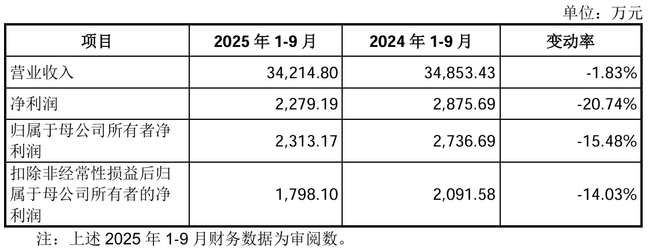 2025年1-9月,公司实现营业收入3.42亿元,同比减少1.83%;归母净利润为2313.17万元,同比减少15.48%;扣非归母净利润为1798.10万元,同比减少14.03%。