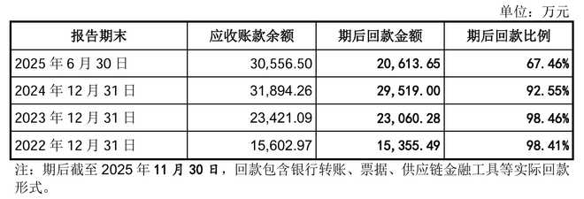 公司应收账款余额的期后回款比例分别为98.40%、98.34%、86.40%和42.77%,2025年6月末应收账款回款相对较低。