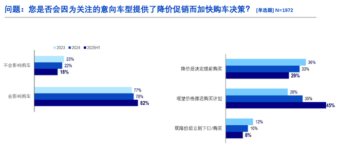 咨询公司罗兰贝格与汽车之家连续三年发布《中国乘用车量价趋势与价格策略研究报告》。2025年上半年报告指出,面对降价促销政策而选择推迟购车的“观望者”比例,从2023年的28%大幅升至2025年上半年的45%。