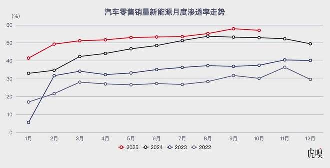 还有一个必须考虑的负面因素,是2026年注定发生的新能源购置税政策“退坡”。进入2025年之后,新能源渗透率的增长进一步放缓(2023年渗透率同比增幅为30%;2024年渗透率同比增幅为34%;2025年前10月渗透率同比增幅仅为11%),虽然9月渗透率数值再创新高,但新能源汽车的总零售量却在同比下降。