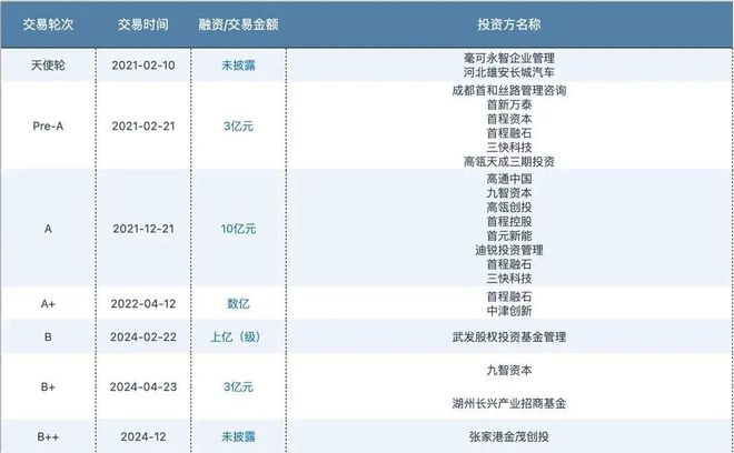 根据投中嘉川CVsource显示,成立至今,毫末智行共完成了7轮融资,累计融资金额在20亿元左右。其中金额最大的为2021年底官宣的A轮融资,金额为10亿元人民币,投资方为美团、高瓴创投、高通创投、首程控股、九智资本等。这笔融资在当时赚足了眼球,该轮融资后,毫末智行正式迈入独角兽行列,投后估值超10亿美元。