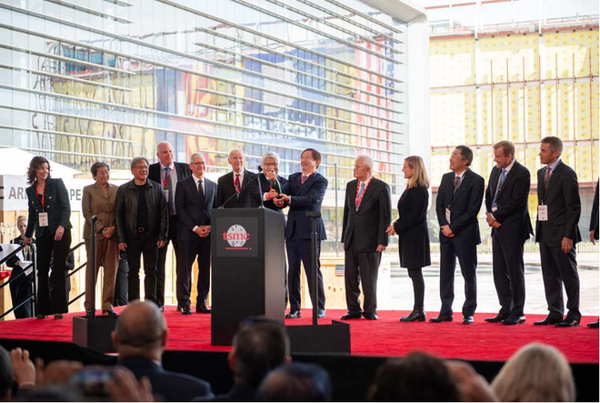 时任美国总统拜登亲临站台,高呼“美国制造业回来了”,宣称“台积电将助力美国赢得21世纪经济竞争”,苹果、英伟达、阿斯麦等科技巨头 CEO环绕两侧,让这场工业仪式充满浓厚政治色彩。